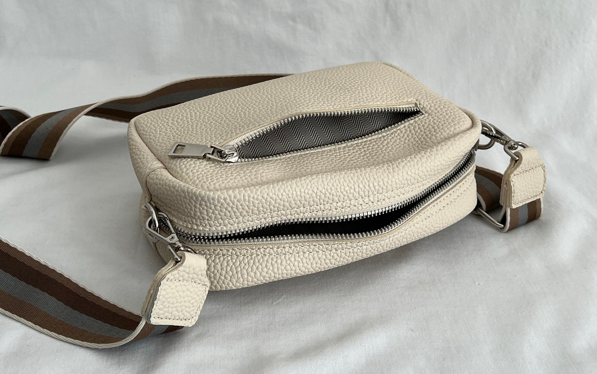 The ultimate crossbody. She fits all your essentials including an iPhone 14 Pro Max and is the perfect go-to, everyday piece for all ages. Has two external pockets for extra storage and internal compartmentalisation for added organisation.