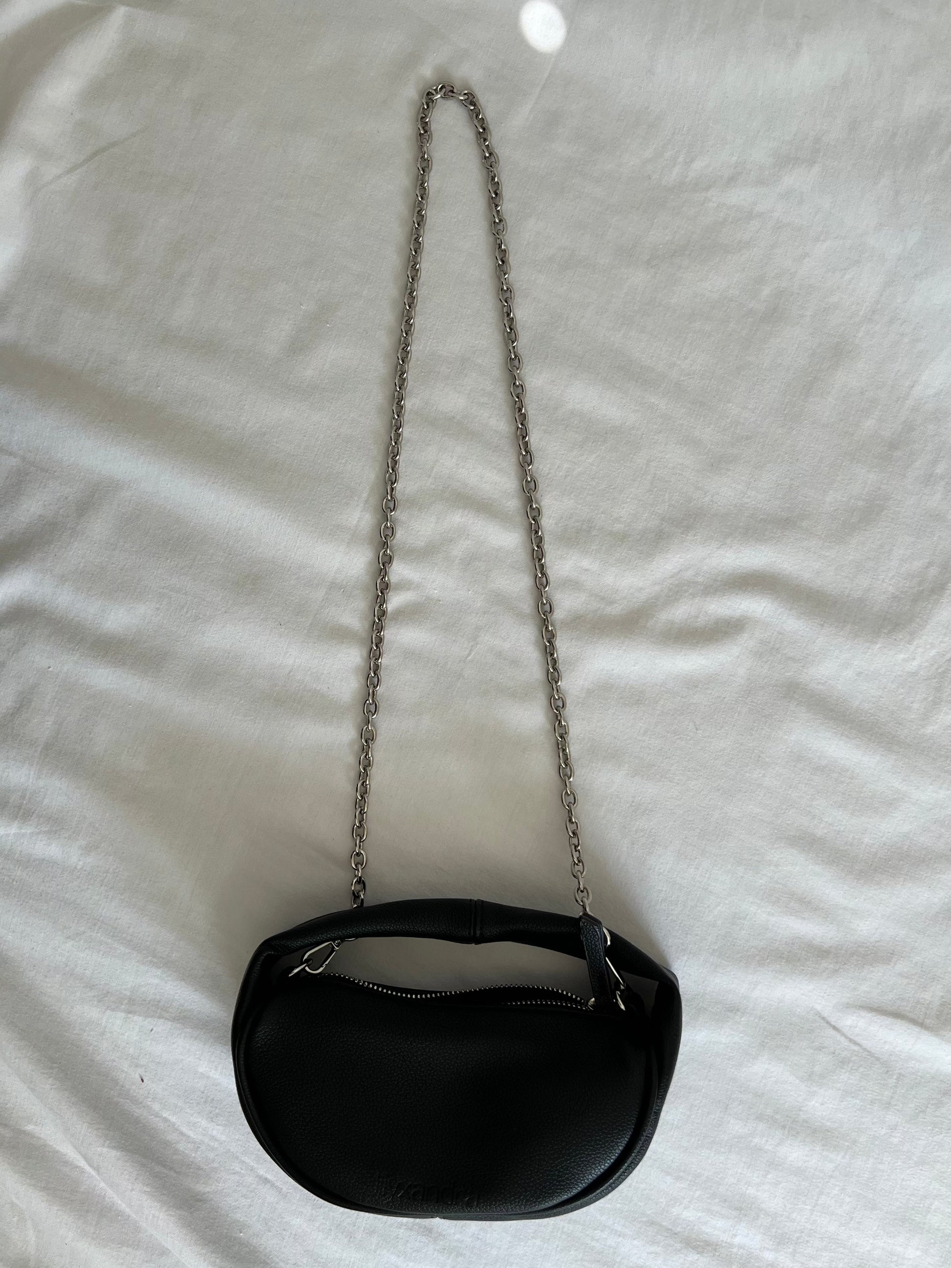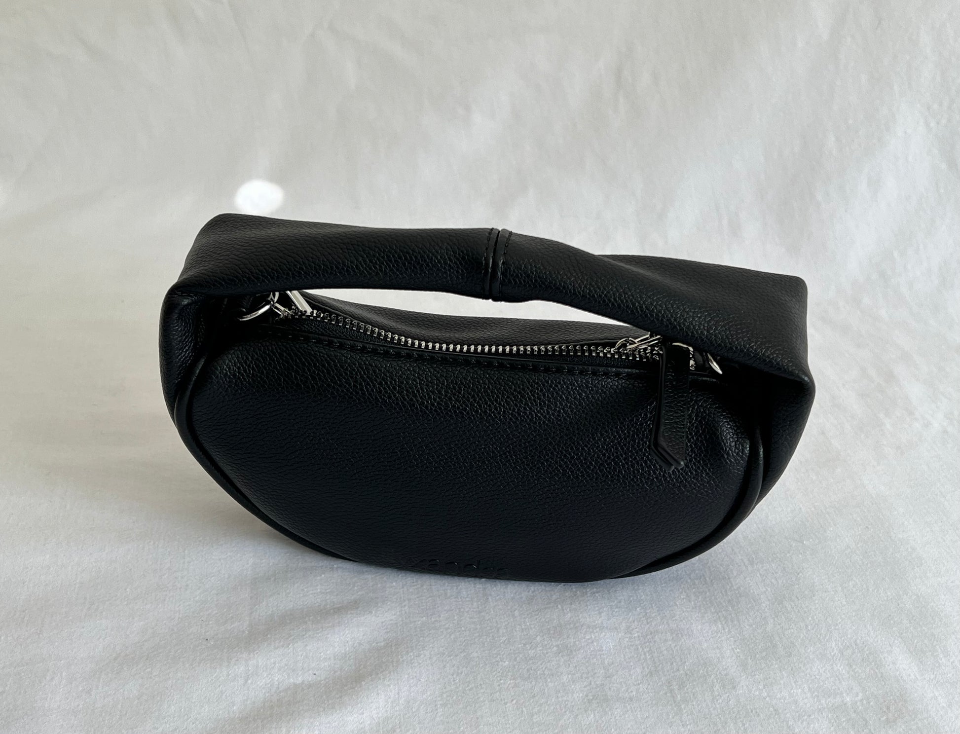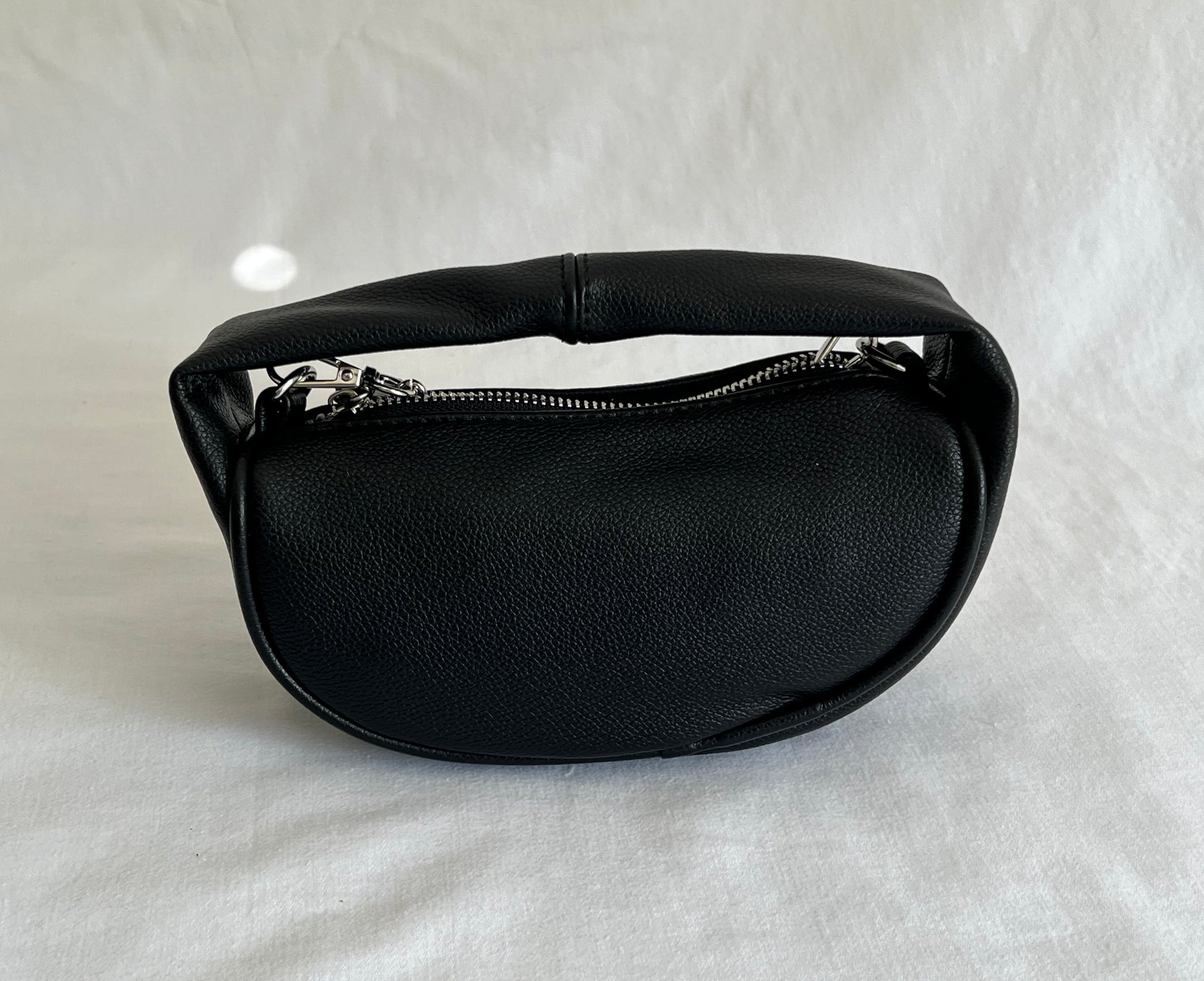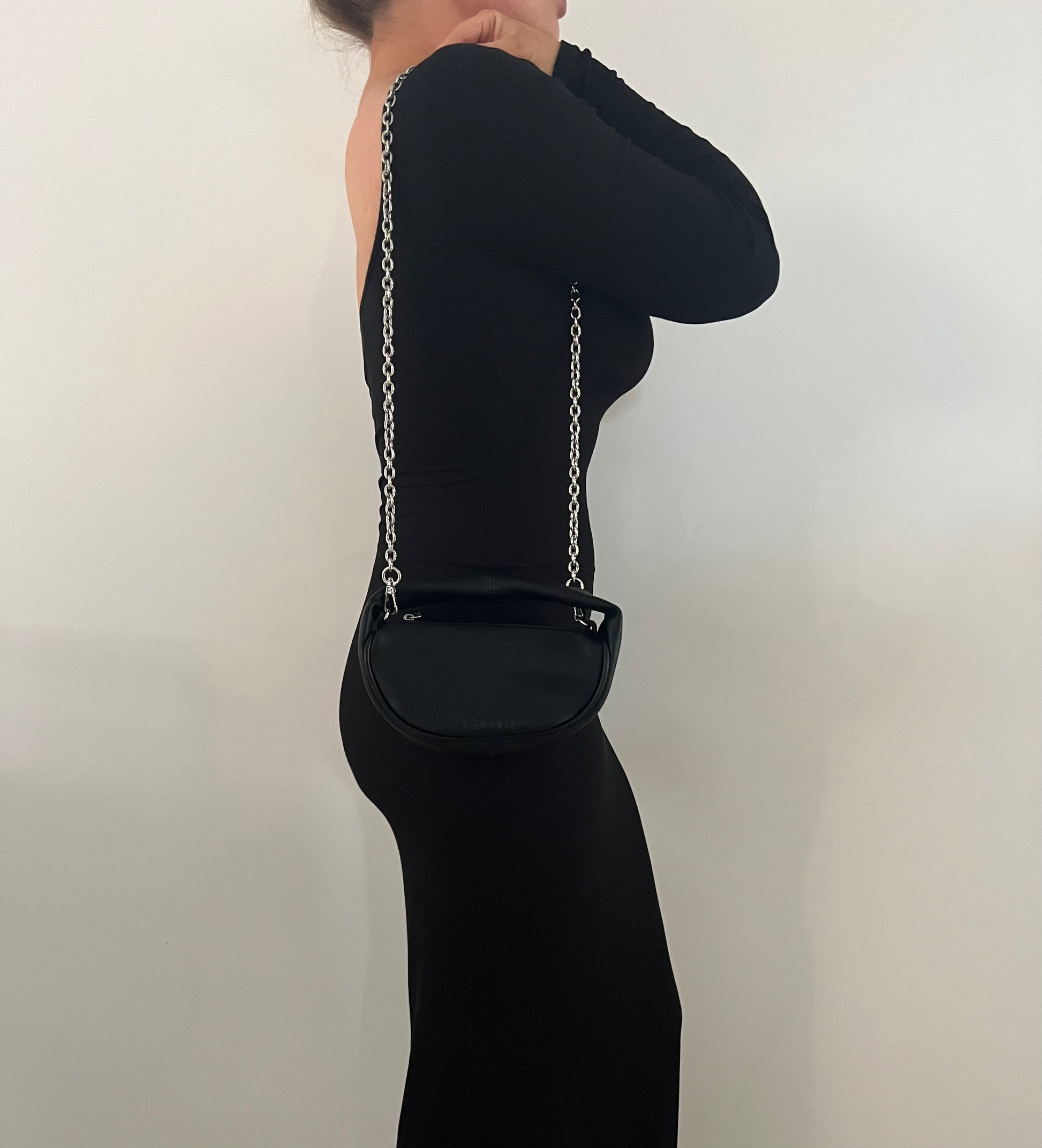 A crescent shape with top handle to easily carry all day, the detachable silver chain allows her to be carried at a longer length, over the shoulder or across the body + the zip closure adds that extra bit of security. Fits an iPhone 14 Pro Max.