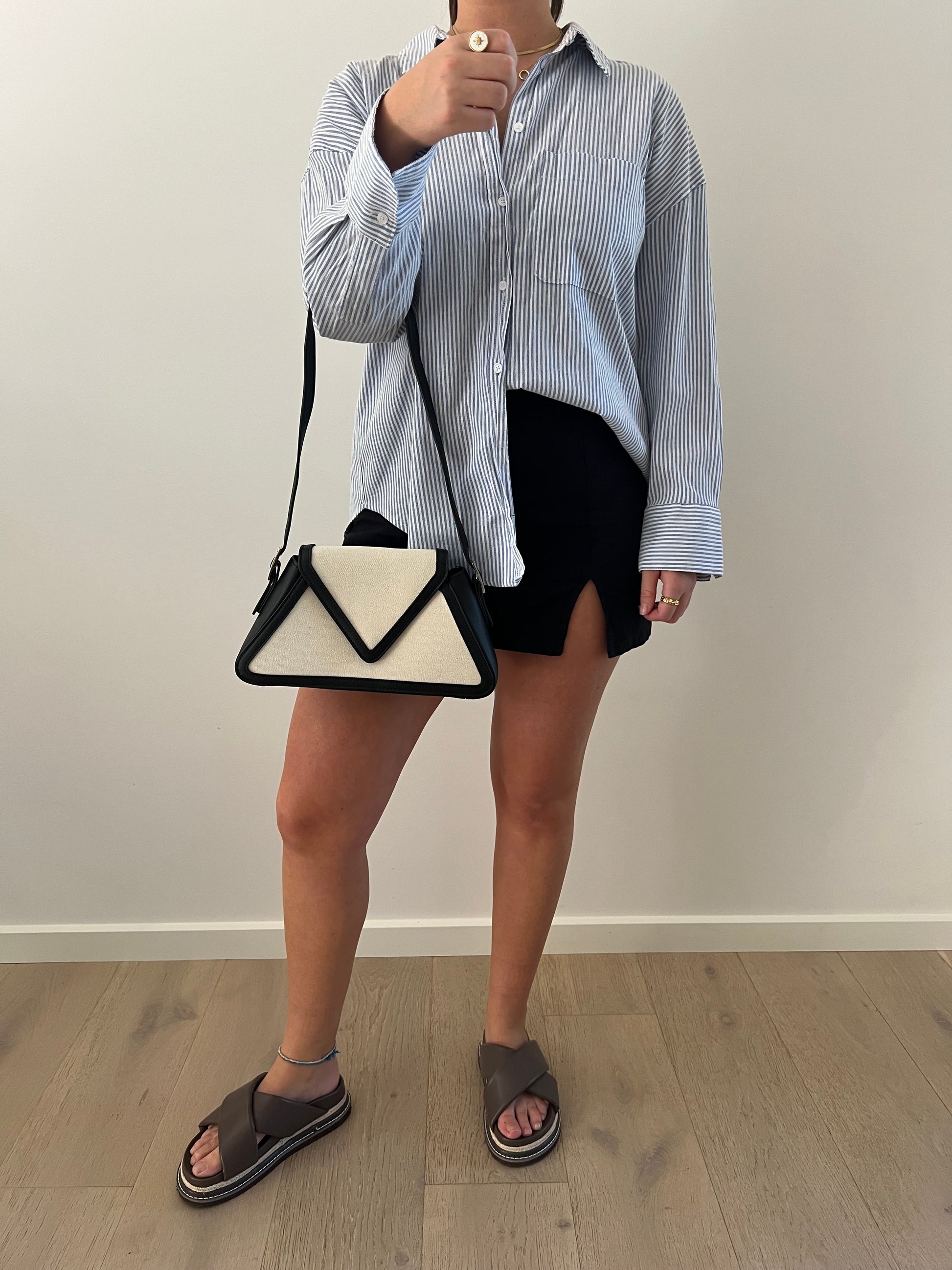 A triangular accented shoulder flap bag with magnetic clasp and internal divisions to keep your belongings safe, secure & organised (easily fits an iPhone 14 Pro Max).